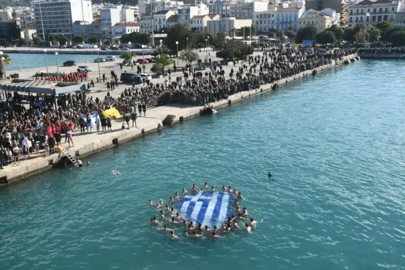 Αρχικά παρέστησαν στην δοξολογία στον Ι.Ν. Ευαγγελιστρίας και στη συνέχεια στο μόλο της Αγίου Νικολάου όπου έγινε η ρίψη του Σταυρού.