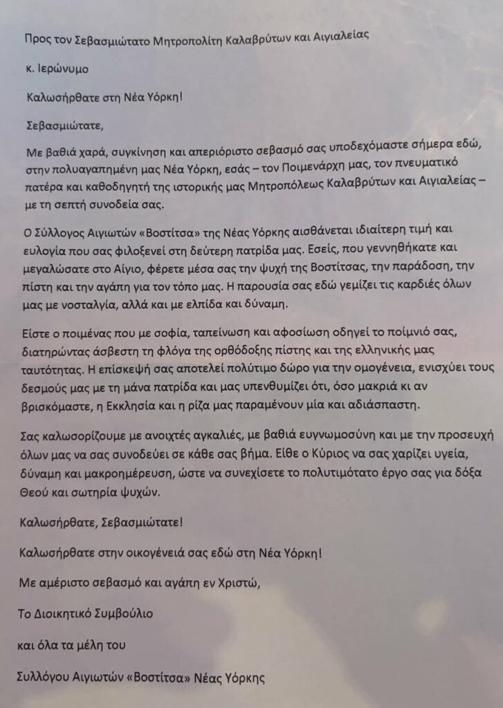Σε ιδιαίτερα συγκινητικό κλίμα πραγματοποιήθηκε η συνάντηση του Συλλόγου Αιγιωτών Νέας Υόρκης «Βοστίτσα» με τον Σεβασμιώτατο Μητροπολίτη Καλαβρύτων και Αιγιαλείας κ. Ιερώνυμο, στο πλαίσιο της επίσημης επίσκεψής του στις Ηνωμένες Πολιτείες για τους εορτασμούς της Εθνικής Επετείου.