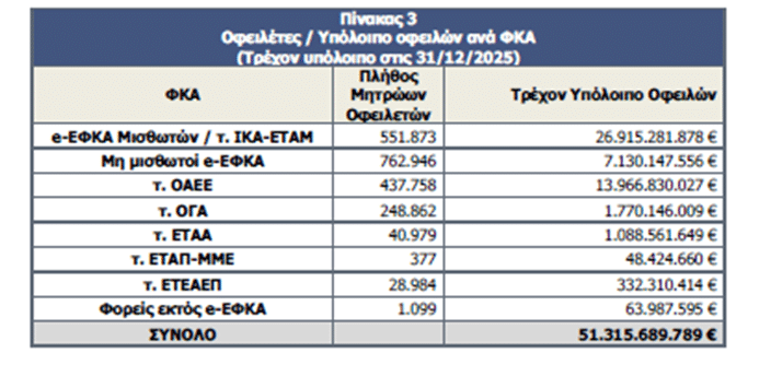 Αποκαλυπτική είναι η εικόνα των οφειλών-οφειλετών του ΚΕΑΟ που δημοσιεύθηκε πρόσφατα από τον ΕΦΚΑ για το δ’ τρίμηνο του 2025. Σύμφωνα με την 4η Τριμηνιαία Έκθεση Προόδου έτους 2025 του ΚΕΑΟ (Οκτώβριος-Δεκέμβριος 2025) ενώ το συνολικό χρέος στο Κ.Ε.Α.Ο. στις 31/12/2024 ήταν σχεδόν 49,3 δις € και στις 30/9/2025 σχεδόν 50,7 δις €, τώρα, το 2025 έκλεισε με οφειλές στο ποσό των 51.315.689.789 € (σχεδόν 51,3 δις €), δηλαδή σχεδόν ίσο με το 1/4 του ΑΕΠ!!