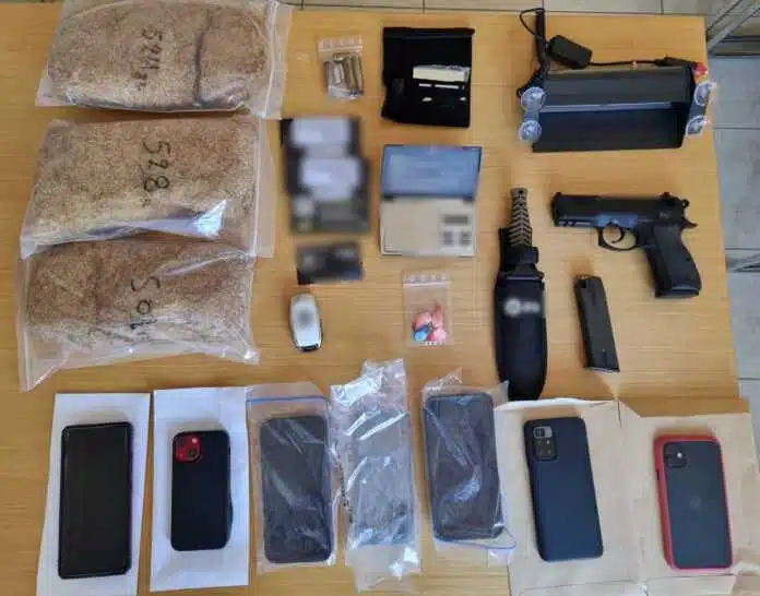 Σε κατ΄οίκον έρευνες βρέθηκαν και κατασχέθηκαν 4 αυτοκίνητα και 3 μοτοσικλέτες, αεροβόλο πιστόλι, γεμιστήρας με ένα φυσίγγιο, 9 κινητά τηλέφωνα, 5.169 ευρώ, 1,6 γρ, κοκαΐνης και ηλεκτρονική ζυγαριά ακριβείας.