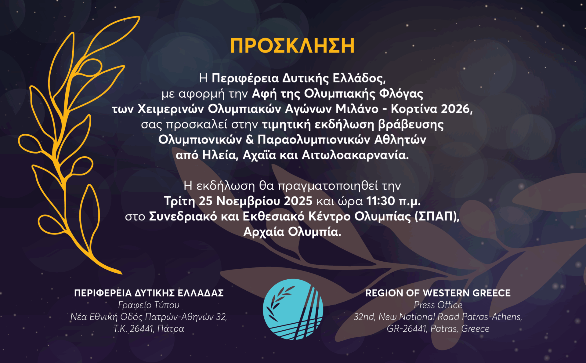 Με φόντο την Αφή της Ολυμπιακής Φλόγας για τους Χειμερινούς Ολυμπιακούς Αγώνες «Μιλάνο – Κορτίνα 2026», η Περιφέρεια Δυτικής Ελλάδος ετοιμάζεται να τιμήσει τους αθλητές που έχουν διαπρέψει στο κορυφαίο αθλητικό γεγονός του πλανήτη.