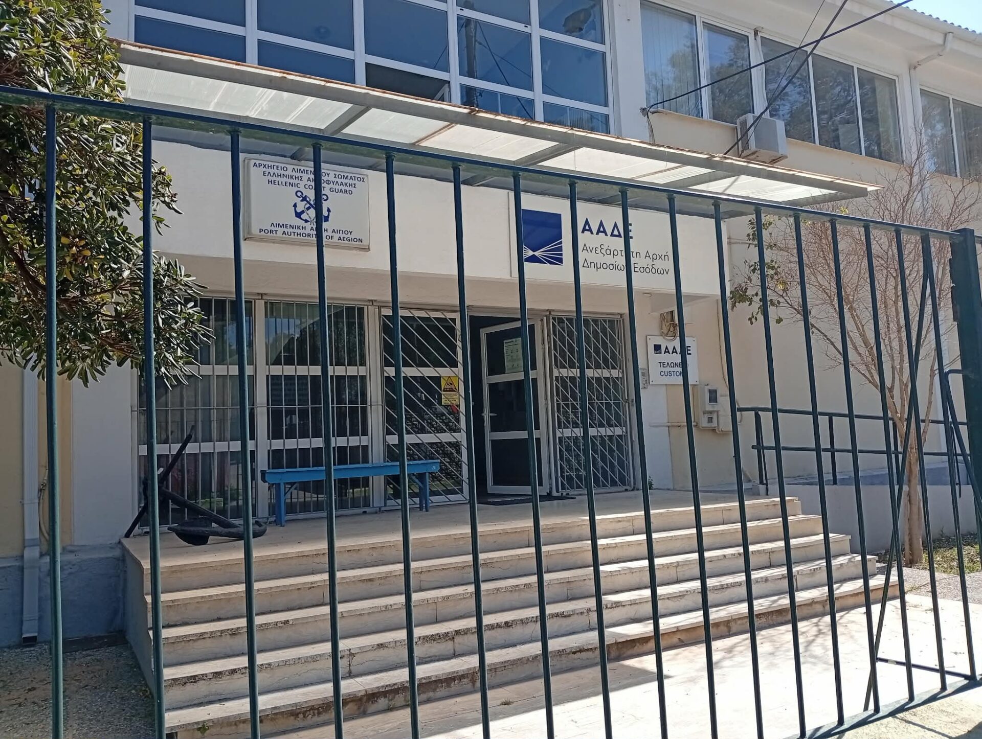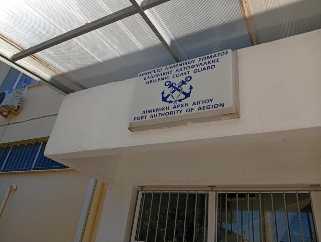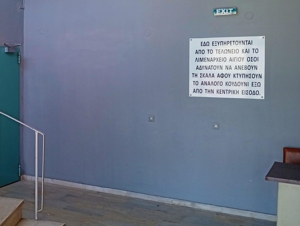 Στην είσοδο του κτιρίου που στεγάζει το Λιμεναρχείο και το Τελωνείο Αιγίου, μια πινακίδα στέκει εκεί για να υπενθυμίζει ότι το ελληνικό κράτος όταν αδυνατεί να προσφέρει τα αυτονόητα, επιστρατεύει το… χιούμορ του παραλόγου.