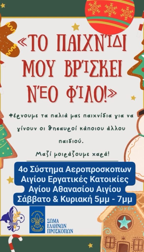 Η δράση προσφοράς της Περιφερειακής Εφορείας Προσκόπων Δυτικής Πελοποννήσου, υλοποιήθηκε από το 4ο Σύστημα Αεροπροσκόπων Αιγίου τον μήνα Δεκέμβριο, ως η Καλή Πράξη των Χριστουγέννων. Μέλη και Φίλοι του Προσκοπισμού ανταποκρίθηκαν στην πρόσκληση μας και προσέφεραν μεταχειρισμένα παιχνίδια και παιδικά βιβλία σε άριστη κατάσταση, τα οποία συγκεντρώθηκαν στην Εστία μας και διπλώθηκαν σε δώρα με σκοπό να προσφερθούν σε παιδιά που δεν έχουν την πολυτέλεια να αποκτήσουν το δικό τους παιχνίδι αυτές τις γιορτινές ημέρες.