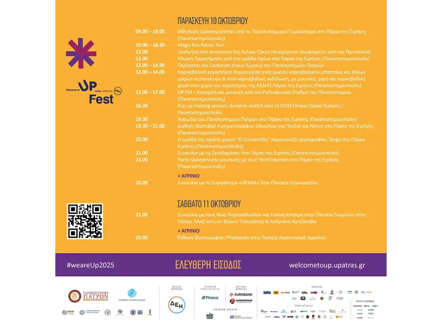 To Welcome to UP 2025 διοργανώνεται από τις 7 έως τις 11 Οκτωβρίου, από το Πανεπιστήμιο Πατρών, σε συνδιοργάνωση με την Περιφέρεια Δυτικής Ελλάδας και το Επιμελητήριο Αχαΐας, σε συνεργασία με τους Δήμους Πατρέων, Αγρινίου και Μεσολογγίου και με τη στήριξη του Υπουργείου Πολιτισμού.