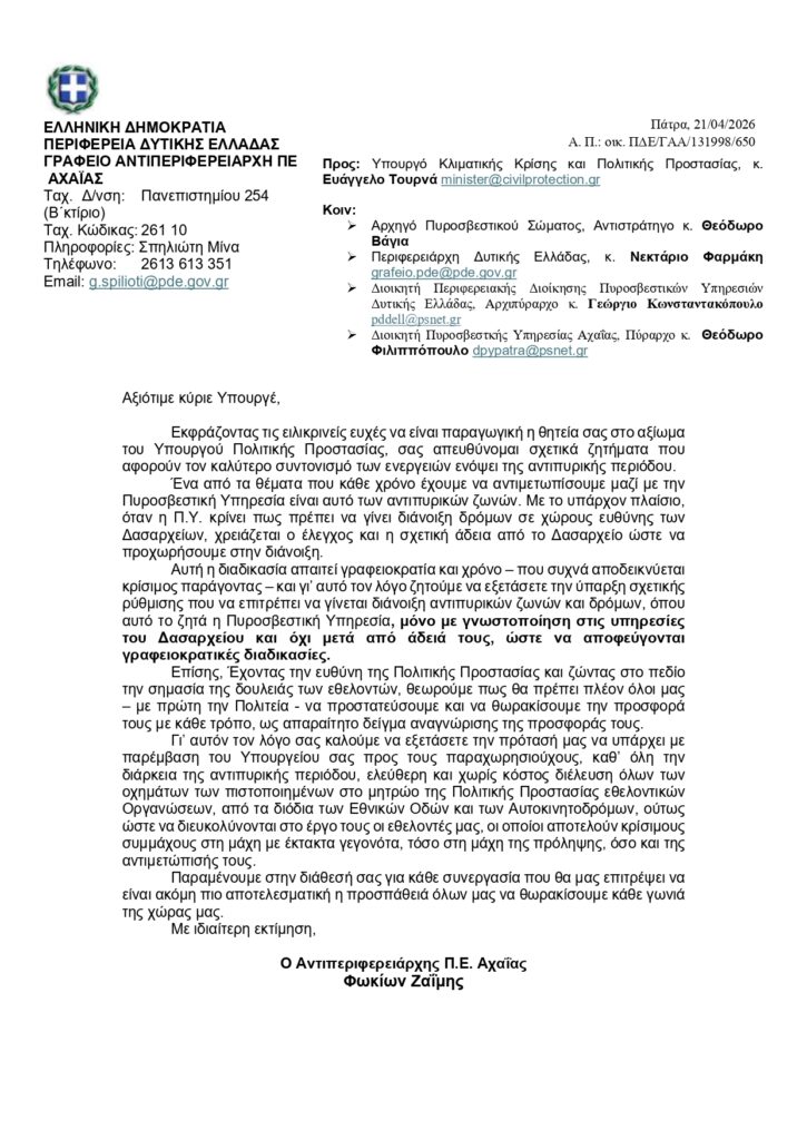 Επιστολή προς τον Υπουργό Κλιματικής Κρίσης και Πολιτικής Προστασίας κ. Ευάγγελο Τουρνά απέστειλε ο Αντιπεριφερειάρχης Π.Ε. Αχαΐας κ. Φωκίων Ζαΐμης, θέτοντας συγκεκριμένα ζητήματα ενόψει της αντιπυρικής περιόδου.
